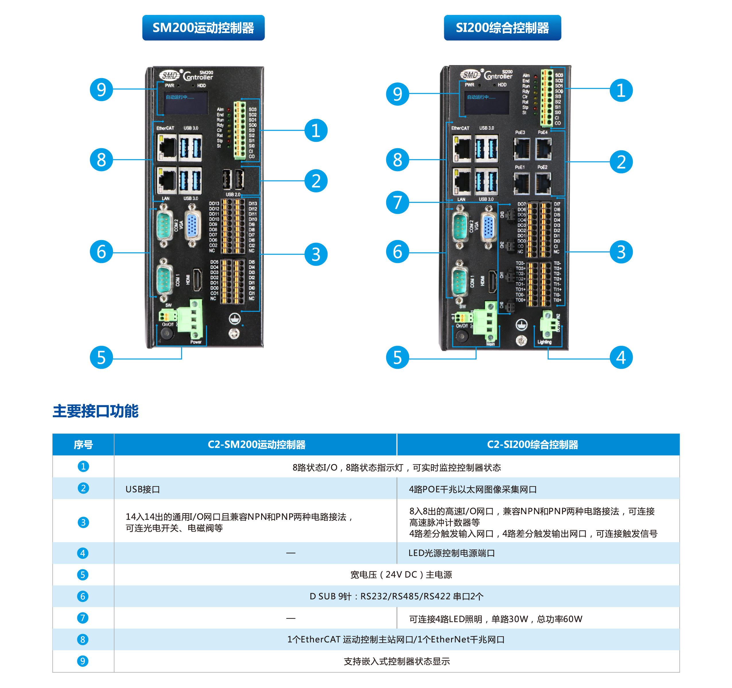 SM200/SI200系列高功能控制器,CPU運(yùn)算能力強(qiáng),可控制到128軸以內(nèi)多軸運(yùn)動(dòng),最多可支待4組機(jī)器人動(dòng)作,SI200配置POE圈像采集網(wǎng)口,可帶視覺(jué)定位功能,可與機(jī)器人、平臺(tái)配合完成精密裝配動(dòng)作。