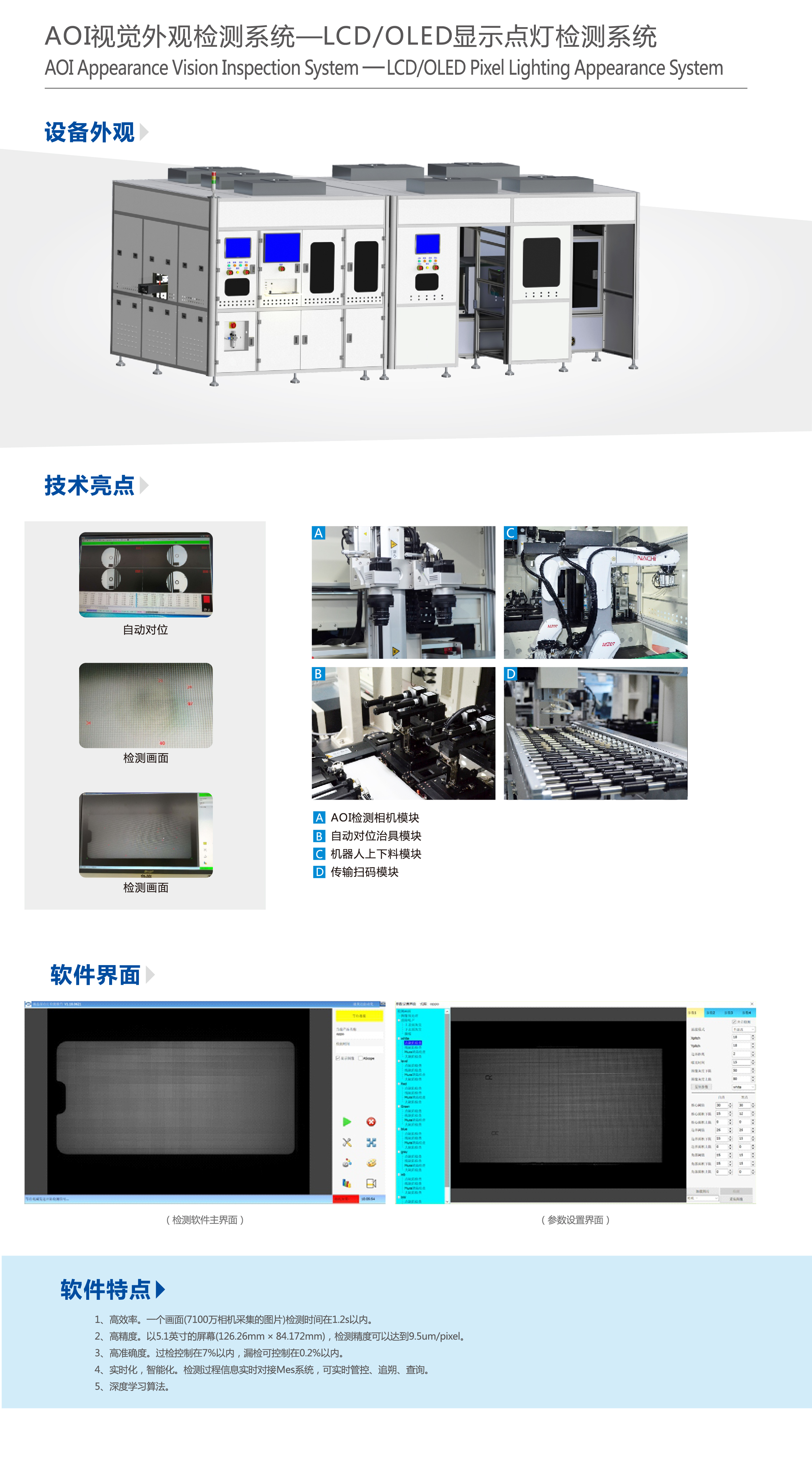 液晶屏顯示缺陷為外觀缺陷,常見的缺陷可分為:點缺陷、線缺陷、MURA缺陷三大類,缺陷可通過人眼在特定條件下分辨出來,因此傳統(tǒng)的液晶屏缺陷檢測常由人工來完成。 但人工檢測方法易受人主觀因素影響,難以檢測微小物體和MURA缺陷,且人眼容易疲勞,有很大局限性。 隨著液晶屏LED、OLED產(chǎn)業(yè)發(fā)展迅速,相關(guān)的制造和檢測設備已經(jīng)呈現(xiàn)出光、氣、電、磁于一體的趨勢,變得越來越自動化、集成化、信息化和智能化。目前很多點燈設備都是離線設備,只能單獨使用。 而在實際的生產(chǎn)過程中,為了保證液晶屏高效生產(chǎn),則希望檢測設備能嵌入在生產(chǎn)流水線中,實現(xiàn)高效率在線檢測,我司全自動點燈檢測設備就是為解決這個方案以實現(xiàn)嵌入式流水線檢測屏幕缺陷。