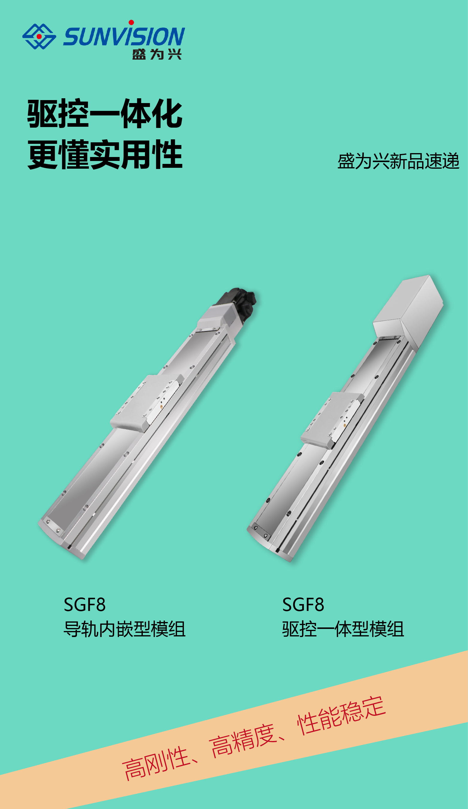 盛為興升級型號的 SGF8 驅控一體型模組,在包含導軌內嵌型模組的優(yōu)勢基礎上,集導軌內嵌式模組、伺服電機、驅動控制器于一體。